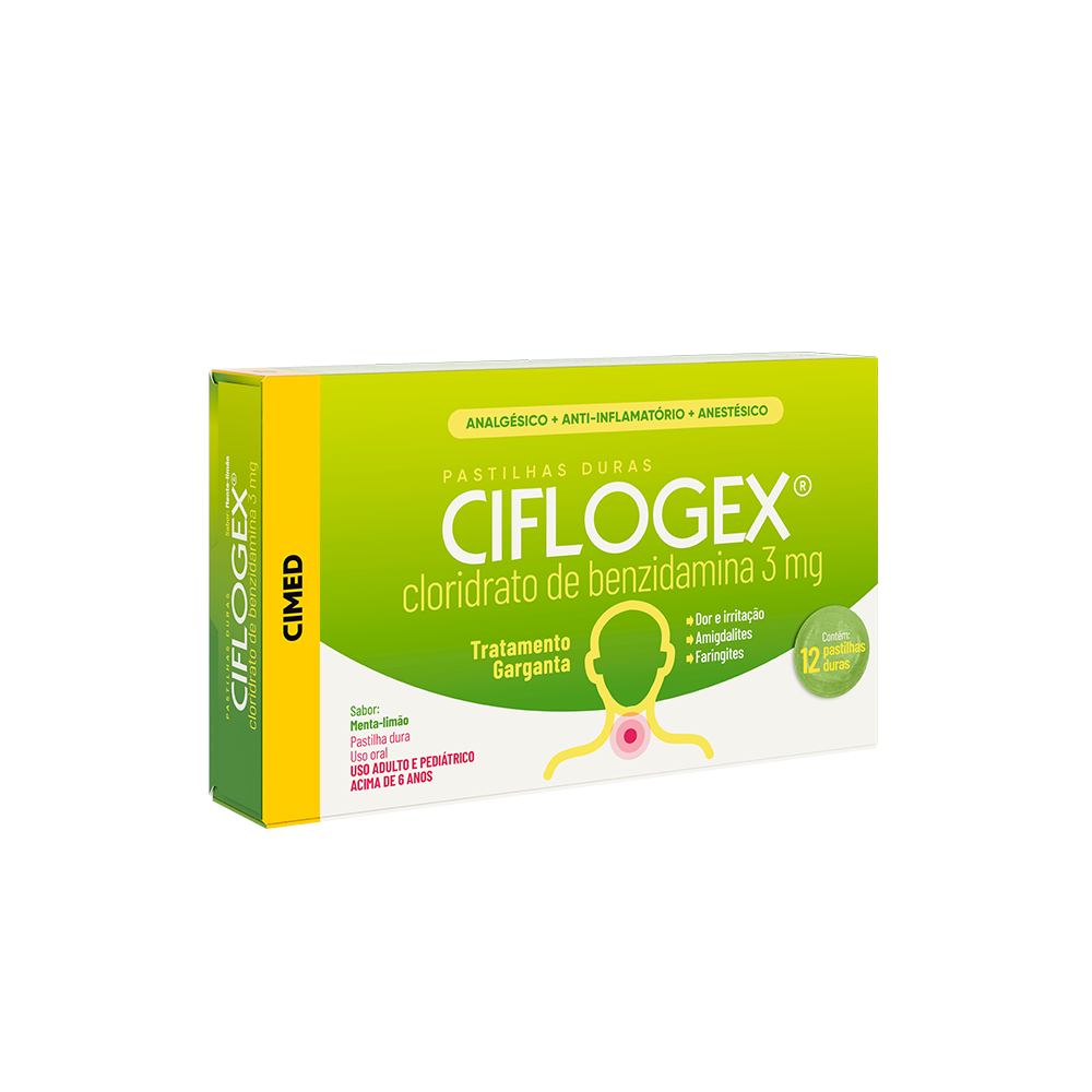 CIFLOGEX® cloridrato de benzidamina. REG. M. S. 1.4381.0080. Analgésico e anti-inflamatório tópico nas afecções bucofaringeanas e no alívio da tosse. Ciflogex é um medicamento. Seu uso pode trazer riscos. Procure o médico e o farmacêutico. Leia a bula. Se persistirem os sintomas o médico deverá ser consultado.